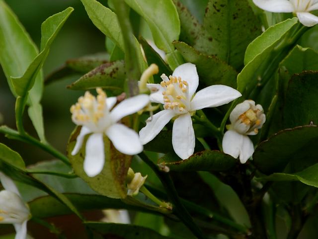 花の姿は他の柑橘類と区別しにくいが、白い5弁花である。