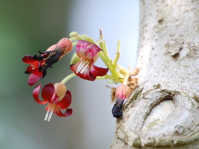 幹や枝から円錐花序(下のほうになるほど枝分かれする回数が多く、全体をみると円錐形になる)を出し、暗い紅紫色のオキザリスに似た花をつける。