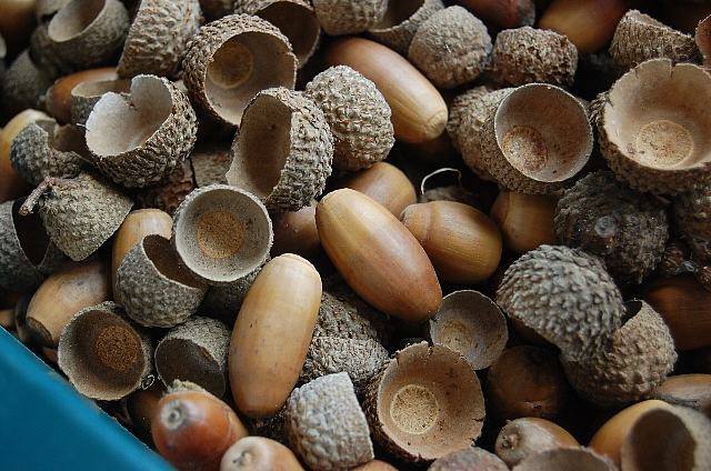 花の後にできる実は堅果(皮が堅く、種と接触せずに種を包んでいる果実)で、秋に熟して長い楕円形のドングリとなる。