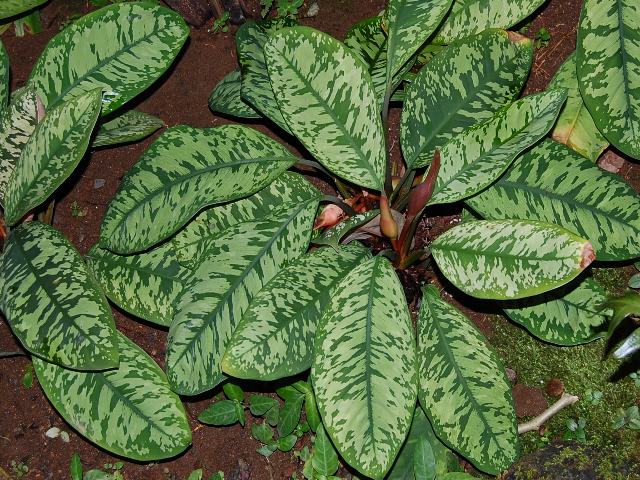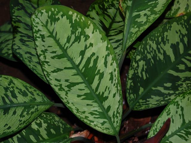 葉は長さが13~20センチくらいの長い楕円形で、濃い緑色の地に白や黄緑色の斑が入る。
