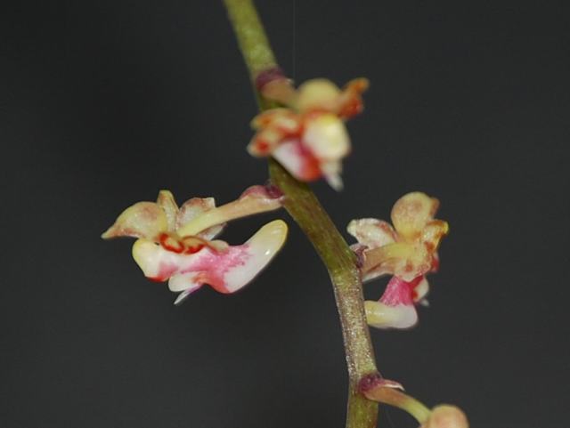 花の色は黄橙色に赤が交じり、距が目立つ。