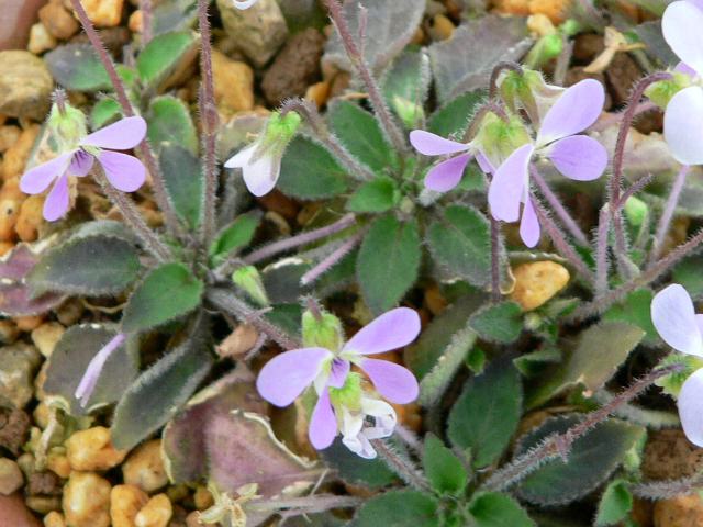 花の色は淡い紅紫色で、つけ根の部分は白く真ん中が黄色い。