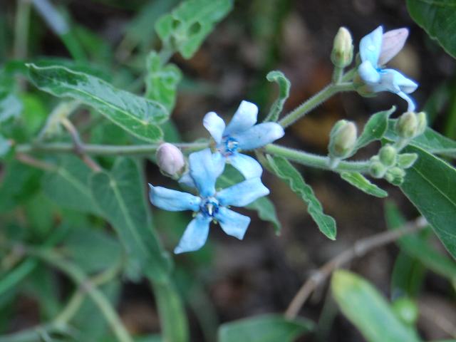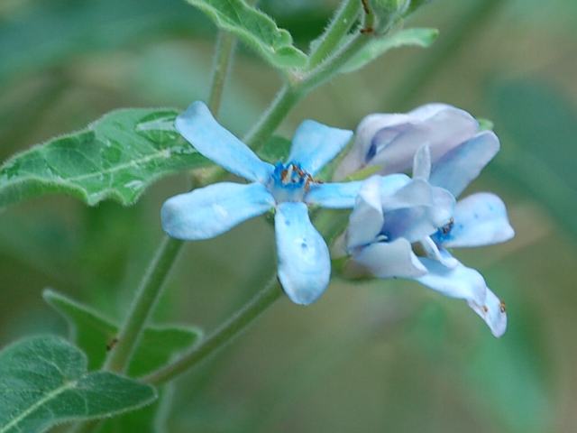 上部の葉の脇から集散花序(茎先に花がつき、少し下から横枝が出てその先にも花がつく)を出し、淡い青色や青紫色の花をつける。