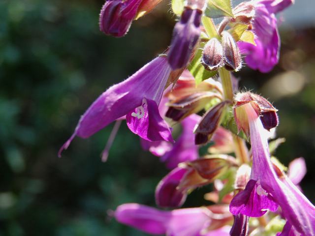 花の先は上下に分かれた唇形で、つけ根のほうは細い筒形となる。