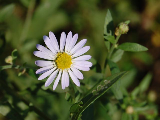 花径は3センチくらいで、舌状花は淡い青紫色をしており、真ん中の筒状花は黄色い。