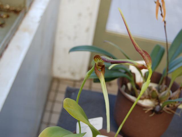 花径は7センチくらいあり細長く、花の色は茶系である。