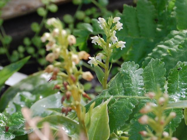 茎先に穂状花序(柄のない花が花茎に均等につく)を出し、白い小さな花をつける。