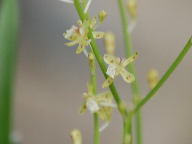 茎先に総状花序(柄のある花が花茎に均等につく)を出し、花径1センチに満たない小さな花を疎らにつける。