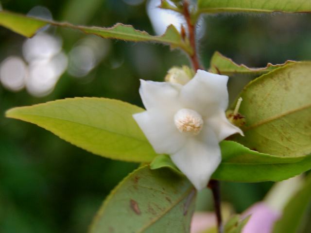 葉の脇に花径2センチから4センチくらいの小振りな白い花を数輪ずつ下向きにつける。