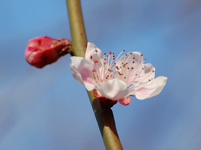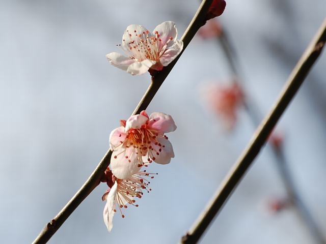 紅梅系・紅梅性の淡い桃色をした一重咲きの中輪(花径20から25ミリ)である。