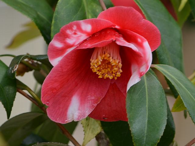 花8センチから10センチの濃い紅色地に白い斑点が入る一重筒裂き、椀咲きの中輪ないし大輪である。