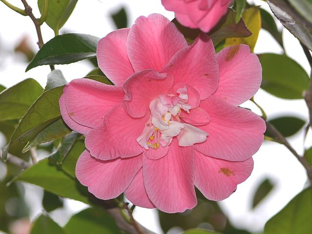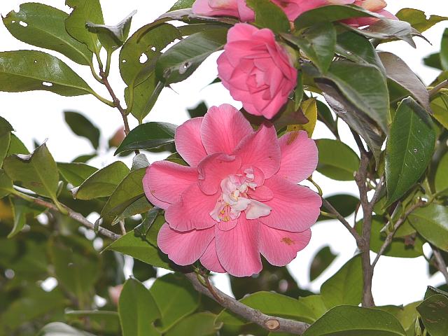花径10センチ以上の紅色地に白雲状の斑が入る八重咲きの大輪をつける。