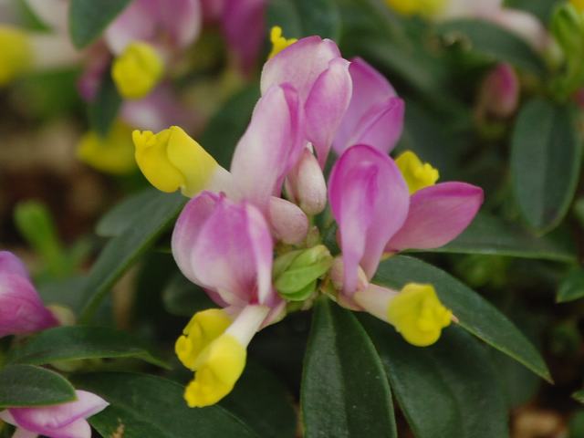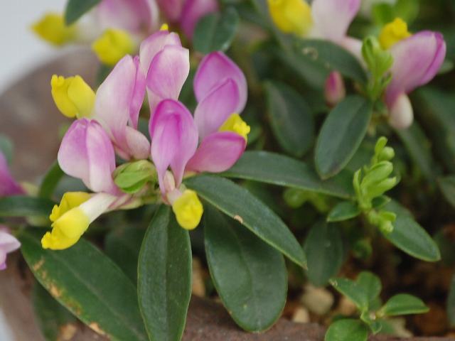 花は蝶形で、竜骨弁が黄色く、翼弁と旗弁は紅紫色である。