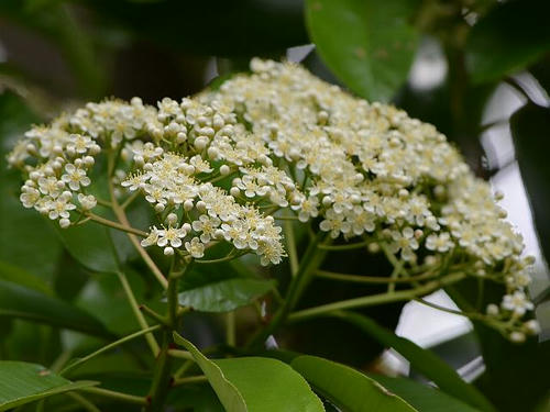 散房花序(柄のある花がたくさんつき、下部の花ほど柄が長いので花序の上部がほぼ平らになる)を出し、白い花をたくさんつける。