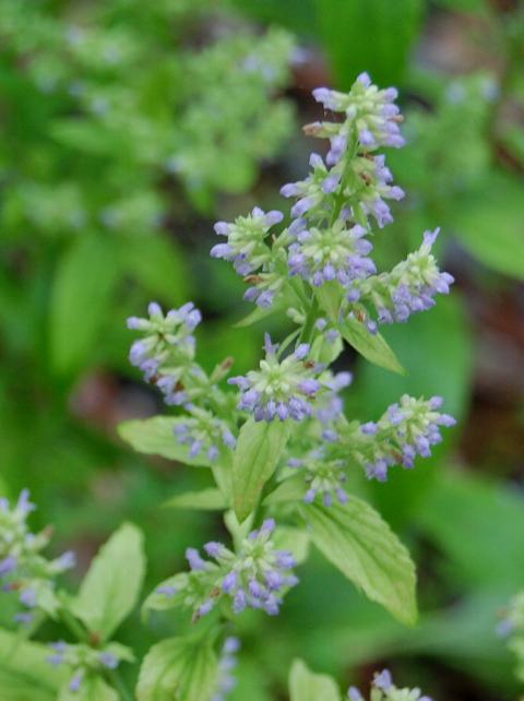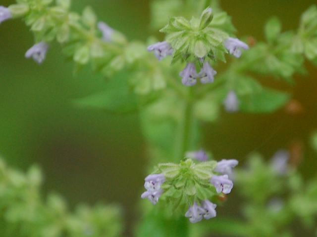 枝先に総状花序(柄のある花が花茎に均等につく)を出し、淡い紫色をした小さな唇形の花をたくさんつける。