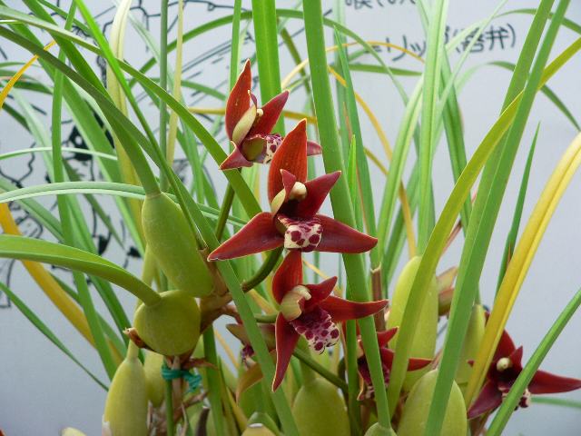 花の色は変化に富むが、基本色は赤で唇弁には赤い斑点が入る。