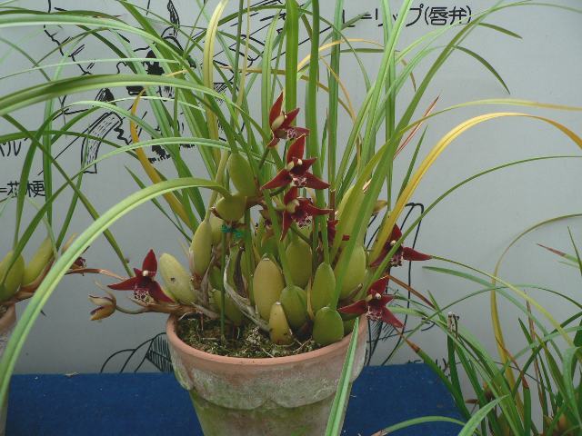 偽球茎(ラン科の植物で地上茎の一部が肥大したもの)は扁卵形で、長さ30センチくらいの線形の葉を1枚出す。