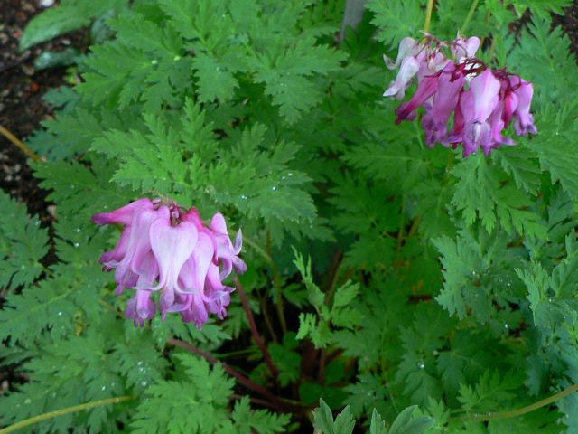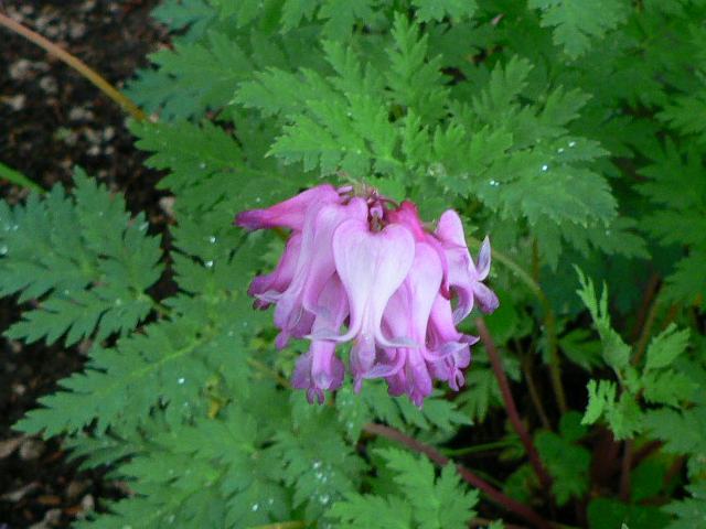 華鬘草(ケマンソウ)と駒草(コマクサ)の中間くらいの小さな花が集まってぶら下がる。