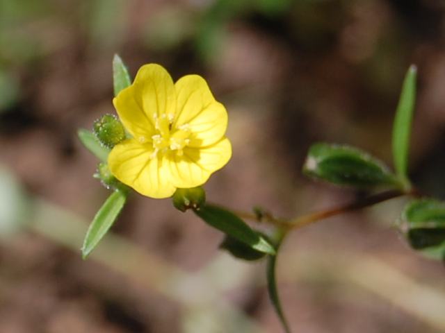 茎の上部の葉の脇に花径1センチから2センチの黄色い4弁花をつける。