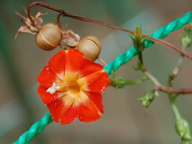 花の色は朱赤色で先が5つに裂け、中心部は黄色い。