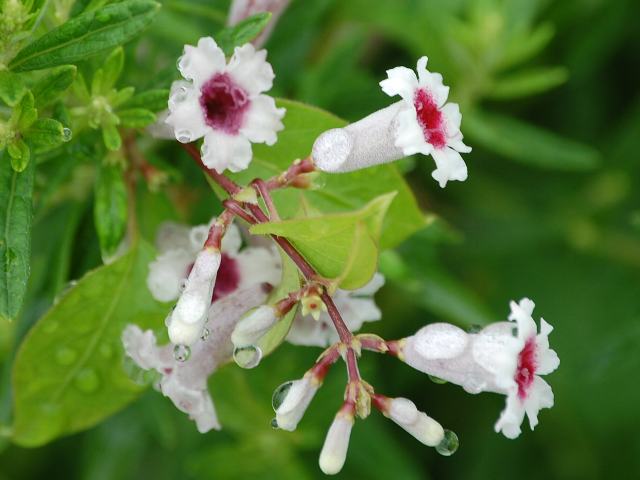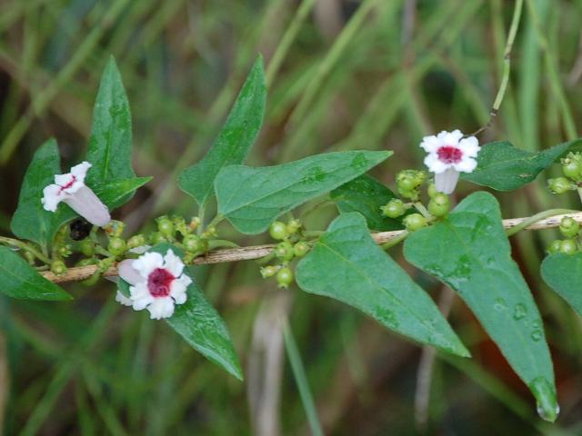 葉の脇から短い集散花序(最初の花が枝先につき、その下に次々と側枝を出して花がつく)を出し、白い花を疎らにつける。