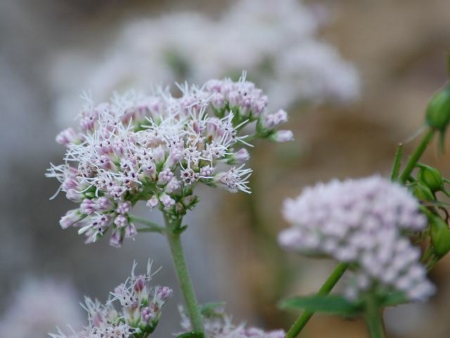茎先に散房花序(柄のある花がたくさんつき、下部の花ほど柄が長いので花序の上部がほぼ平らになる)を出し、白または淡い赤紫色の頭花をたくさんつける。