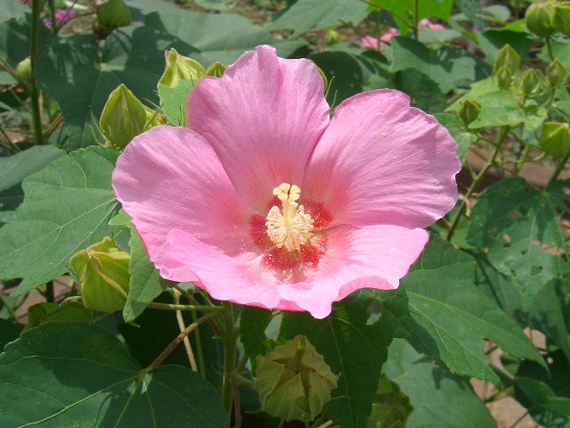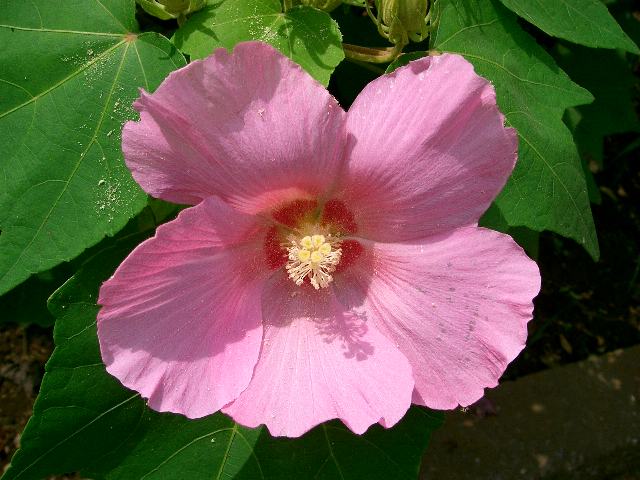 上部の葉の脇に淡い紅色の5弁花をつける。