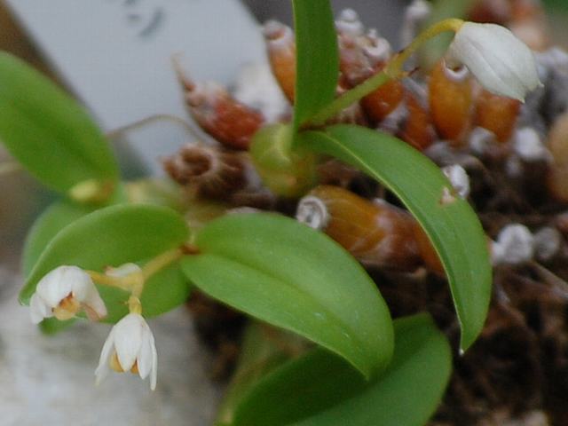 偽球茎(バルブ)の間から花茎を出し、花径10ミリから15ミリくらいの白い花を1輪から3輪くらいつける。