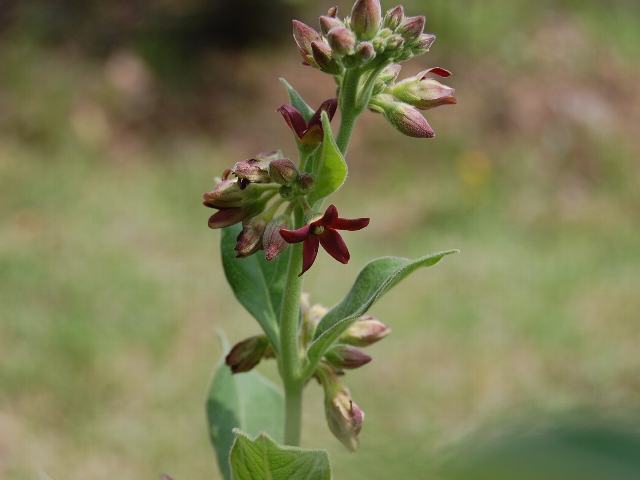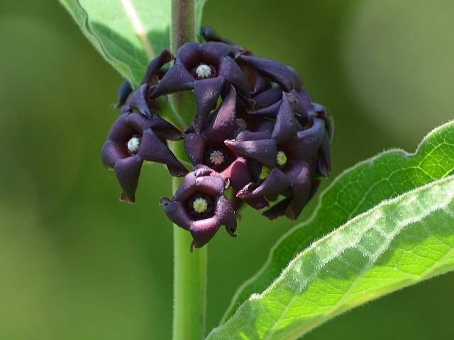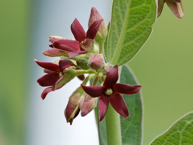 葉の脇に散形花序(枝先に1つずつ花がつく)を出し、花径5ミリから10ミリくらいの暗い紫色の花をつける。