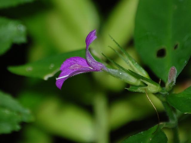 茎先に小さな紅紫色の唇形をした花をつける。