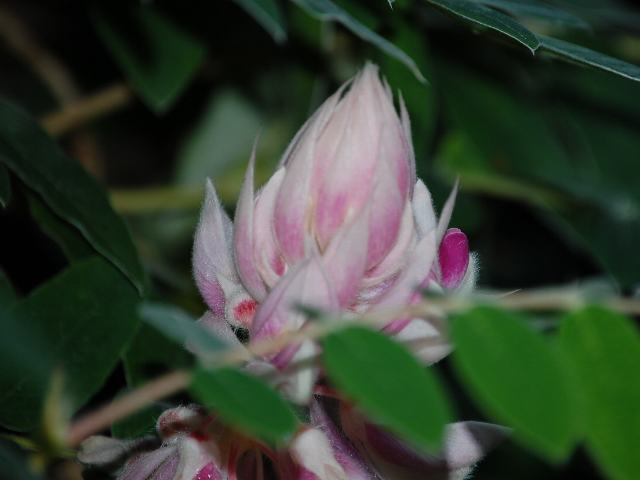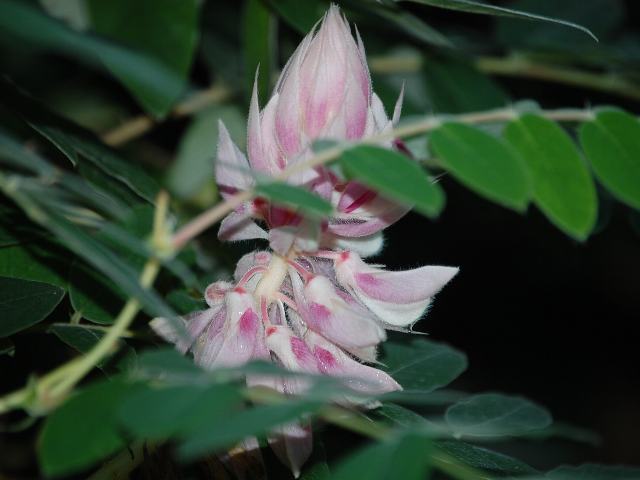 枝先に総状花序(柄のある花が花茎に均等につく)を出し、ピンクの蝶形の花をたくさんつける。