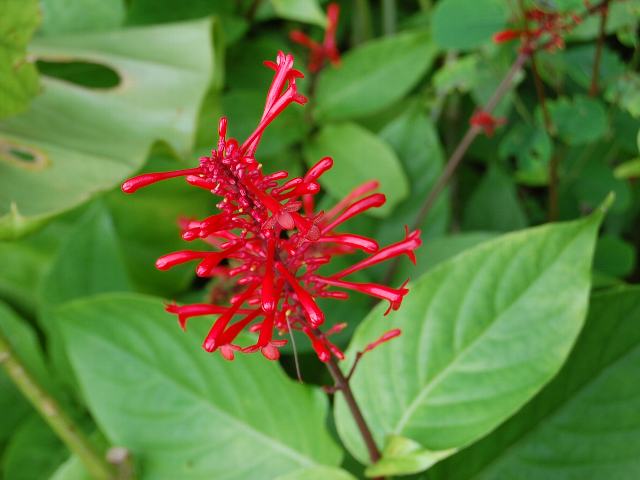 茎先に円錐花序(下のほうになるほど枝分かれする回数が多く、全体をみると円錐形になる)を出し、真っ赤な筒状の花をたくさんつける。