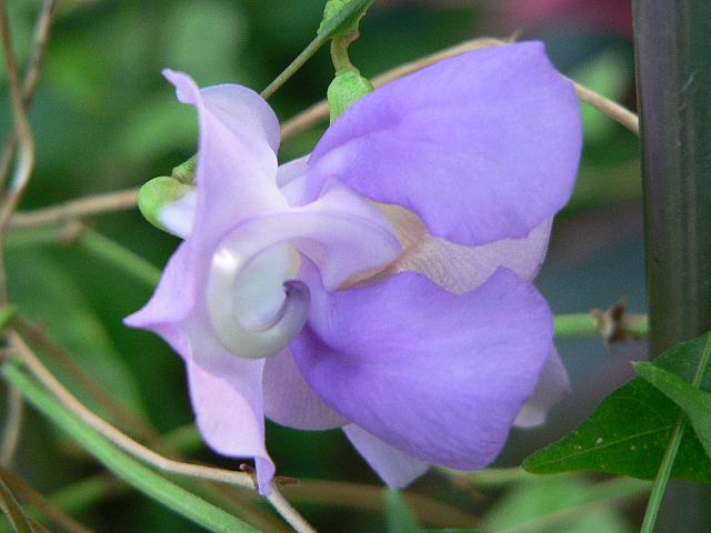 葉の脇から総状花序(柄のある花が花茎に均等につく)を出し、花径4センチくらいの淡い紫色をした蝶形の花を数輪つける。
