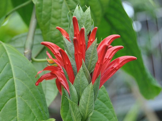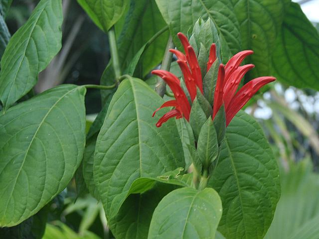 茎先に緑色の苞(葉の変形したもの)を重なるようにつけ、その間に赤い唇形をした花を穂状にたくさんつける。