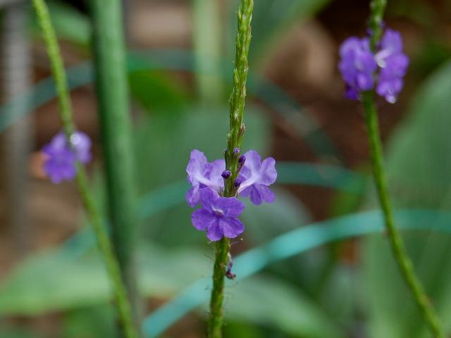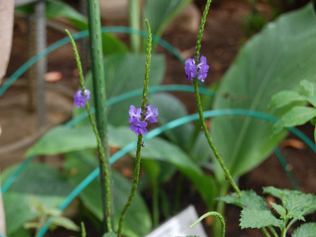 茎先に長さ20~50センチくらいの穂状花序(柄のない花が花茎に均等につく)を出し、濃い紫色の小さな花を1~3輪くらいつける。