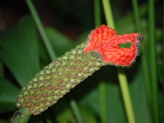 花は肉穂花序(柄のない花が花茎に均等につき、主軸が肉厚に膨らんだもの)である。