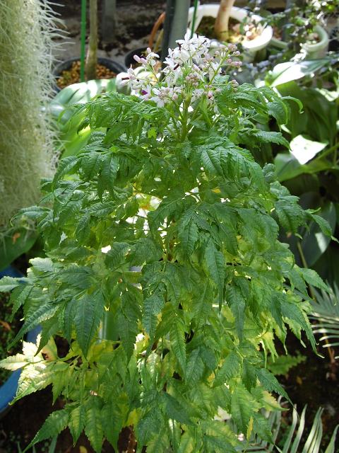 葉は奇数羽状複葉(鳥の羽のように左右に小葉がいくつか並び、先に1つの小葉がついて1枚の葉が構成される)で、互い違いに生える(互生)。
