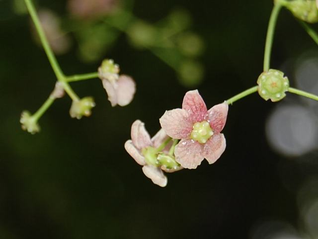 葉の脇から長い柄を出し、花径6~7ミリで淡い緑色ないし淡い紫色を帯びた花を開く。