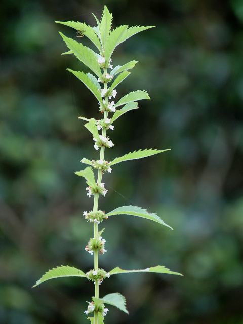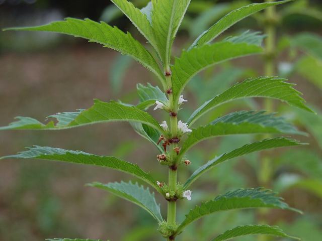 葉は細長い楕円形で向かい合って生え(対生)、縁には鋭いぎざぎざ(鋸歯)がある。