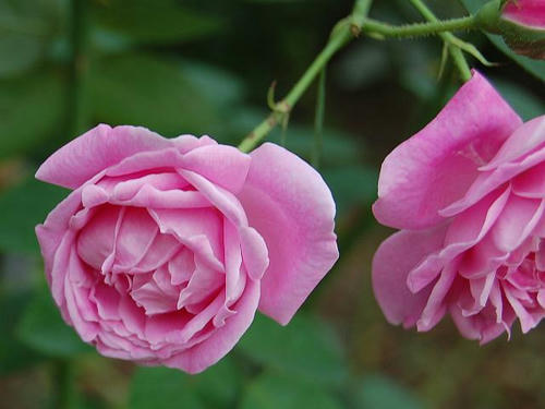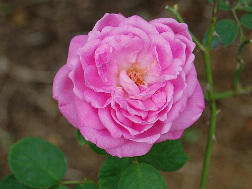 花径6~8センチくらいの丸弁カップ咲きからロゼット咲きの半八重で、花の色はピンクである。