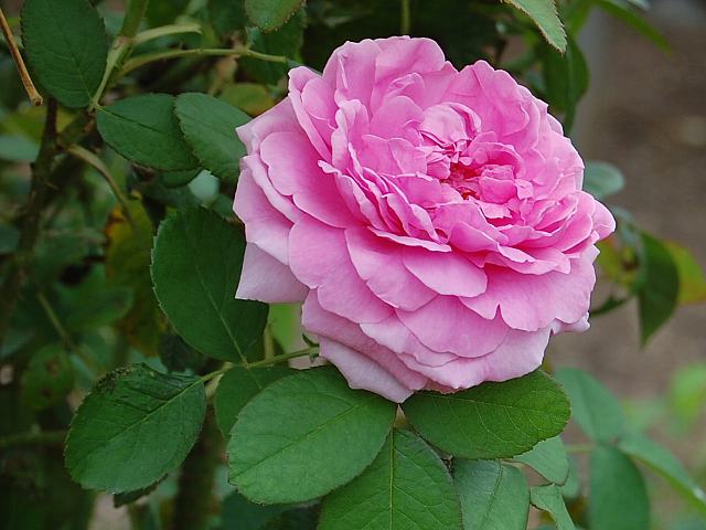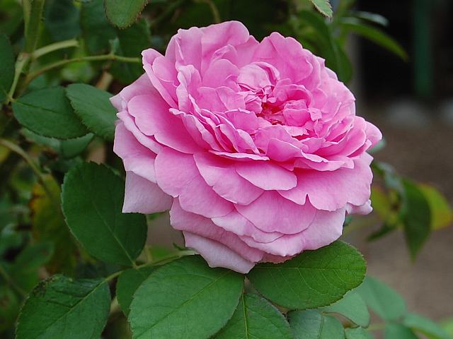 花径9センチくらいのカップ咲きからクォーターロゼット咲きの八重で、花の色はローズピンクである。