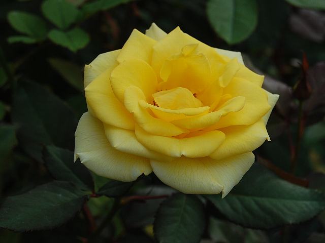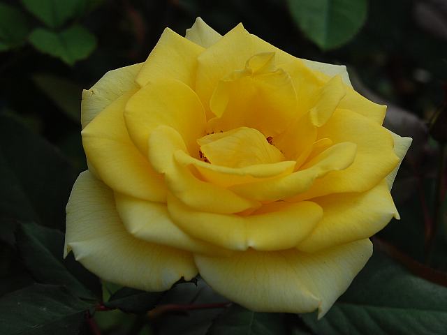 花径11センチくらいの半剣弁高芯咲きの半八重で、花の色は濃い黄色である。