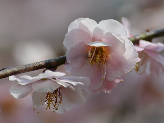 野梅系・野梅性の淡い桃色をした八重咲きの中輪(花径20から25ミリ)である。