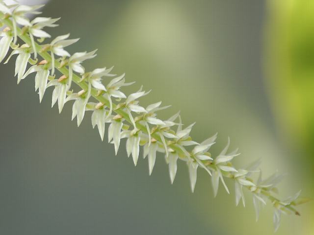 弓状に垂れた総状花序(柄のある花が花茎に均等につく)を出し、花径1センチくらいの小さな黄緑色の花を密につける。