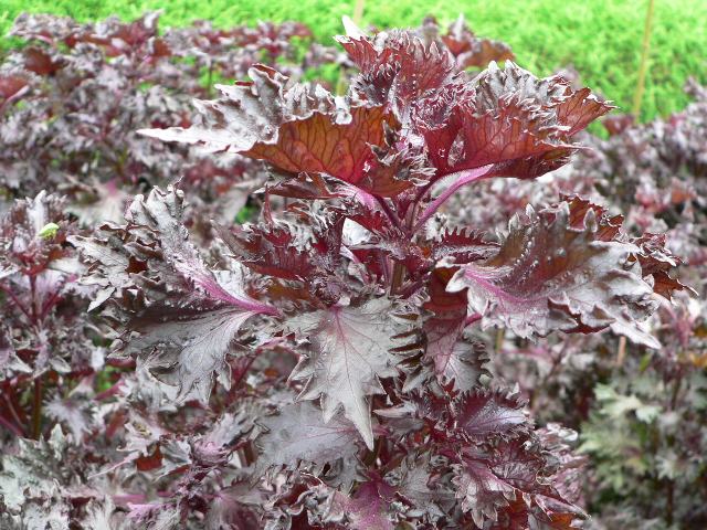 葉の両面ともに暗い紫色で、皺があり縮れる。