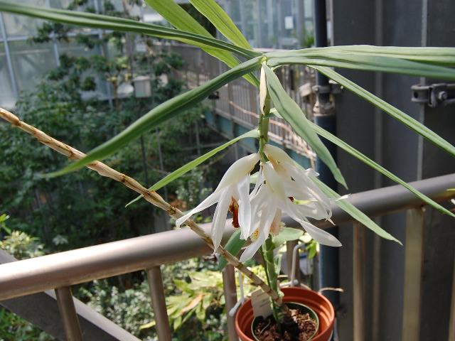 バルブは棒状で、披針形(笹の葉のような形)の葉が互い違いに生える(互生)。