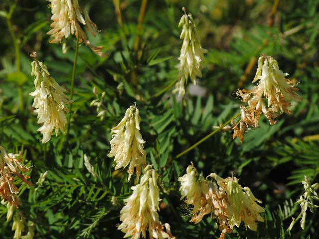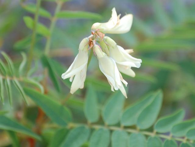 茎の上部の葉の脇に総状花序(柄のある花が花茎に均等につく)を出し、10輪から30輪くらいの黄白色をした蝶形の花をつける。