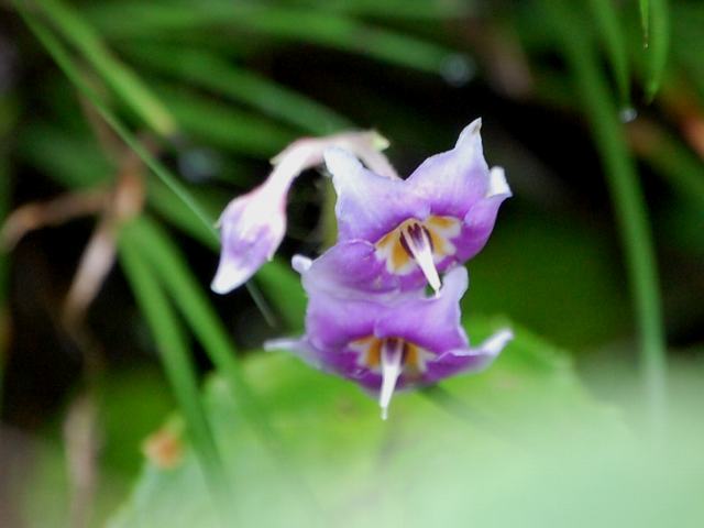 茎先に散形花序(たくさん枝が出て、先に1個つずつ花がつく)を出し、花径10~15ミリくらいの紫色の花を数輪つける。