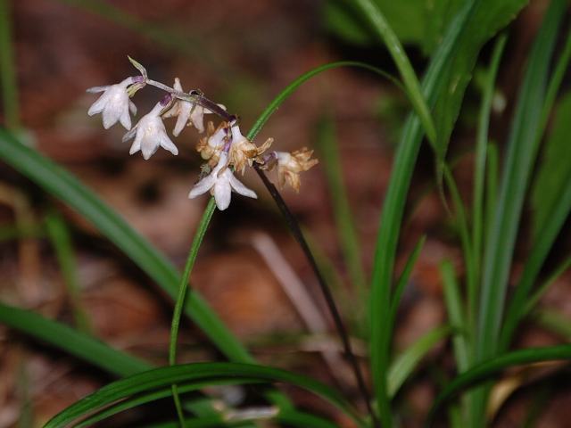 花の色は淡い紫色ないし白で、横向きないし下向きに小さな花をつける。
