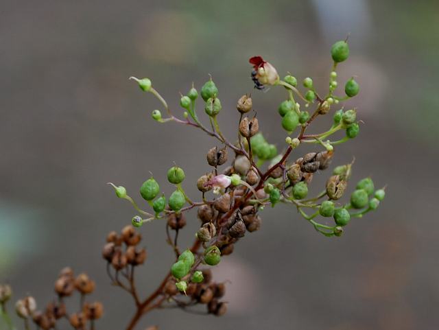 花の後にできる実はさく果(熟すると下部が裂け、種子が散布される果実)である。
